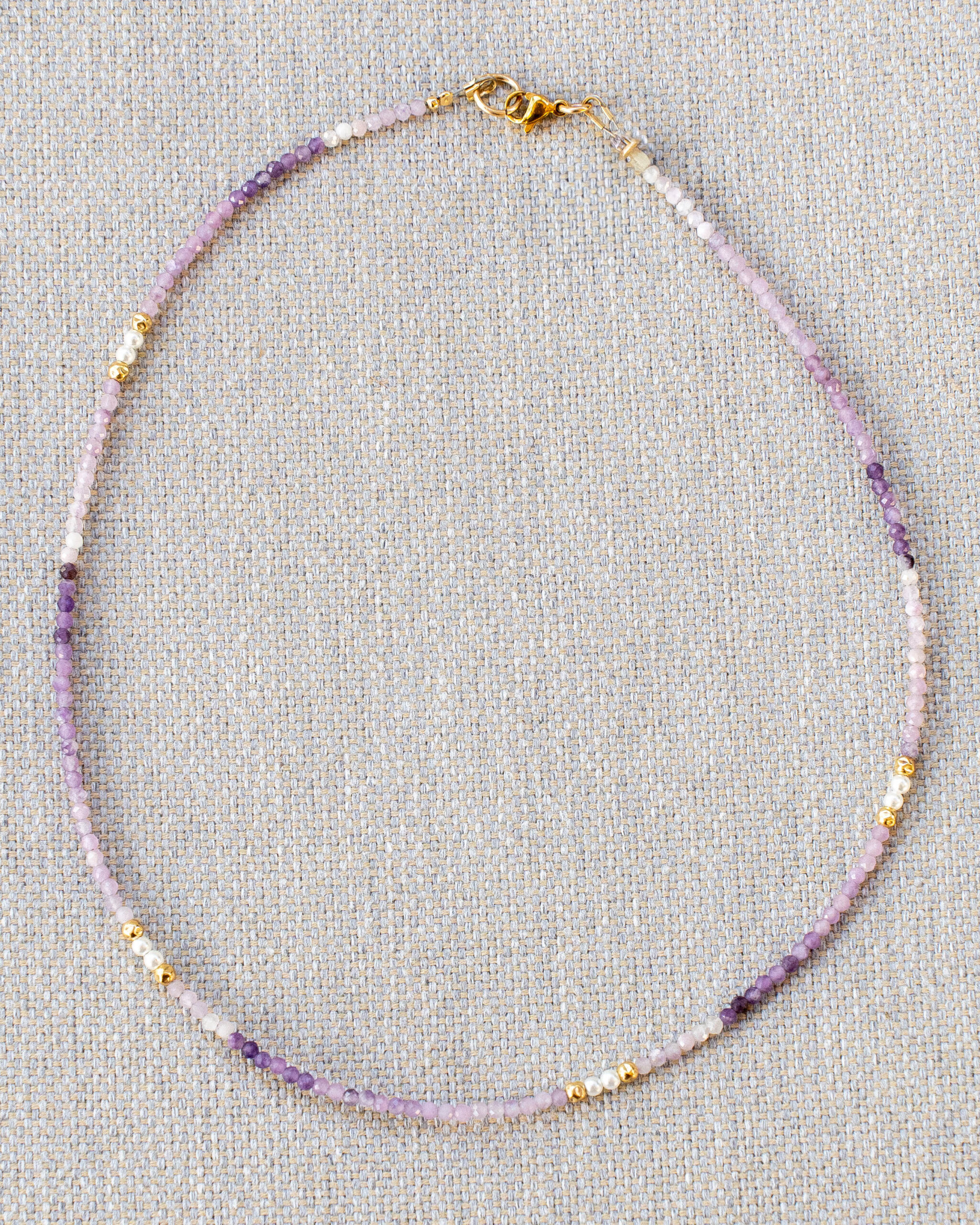 Description: A handmade necklace made of natural amethyst stones in rich purple tones. The combination of shades creates a delicate and magical look — a piece of jewelry that exudes calm, elegance and inner purity. Each piece of jewelry is handmade, with care for quality materials and precise selection of each stone. The combination of gold-filled and stainless steel ensures durability, quality and long-lasting shine. Energetic meaning: Amethyst – helps with mental calm, emotional balance, strengthening intuition and inner wisdom.